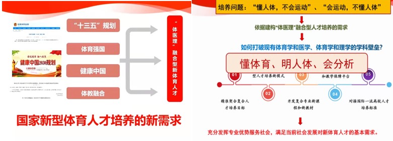 高炳宏教授指出“体医理”融合型新体育人才培养的主要目标是培养“懂体育、明人体、会教学、善训练、能分析”的人才。主要任务是解决体育人才结构单一和社会需求多元化的矛盾,促进体育人才多渠道、多方位、多层次发展。
