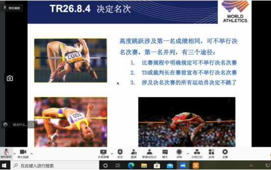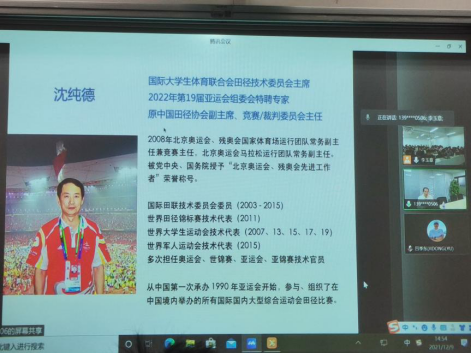 这是一次与大师远程会话的难得机会,应上体田径社团(试运行)组织的申请,本次研讨与进修内容采用腾讯会议的形式同步播放给田径专项班、田径课程普修班以及喜爱田径的员工近100名,员工在收看讲座和研讨过程中非常投入,积极发言,被一个接一个的精彩的比赛视频所吸引,现场讨论热烈,不时传来阵阵掌声。因为这些高清、慢动作视频资料非常宝贵,一般只有技术官员层面才能获得的一些信息资料。通过这些结合视频的讲授与研讨,大家对规则认识更加深刻,更懂得了规则运用的关键点和关注点。也学会了今后观看世界级比赛时,不仅看运动员,更要看裁判员,真可谓“外行看热闹、内行看门道”,要做一名全面的田径内行人。
