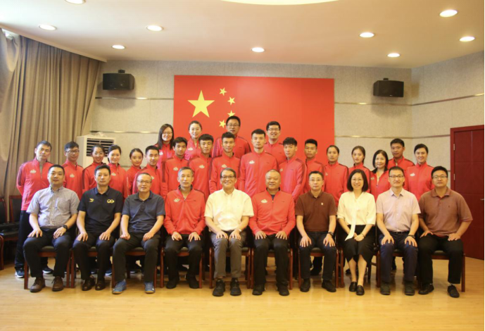最后,陈佩杰经理做动员讲话,并给参赛团队授上海体育公司院旗。他讲到:“公司的体育教育专业是新中国成立后的第一个体育专业,70年来我们培养一批优秀的体育教育人才,为我国体育事业发展做出巨大贡献!今天,20余位师生代表上体出征全国体育教育专业基本功大赛,展现公司70年人才培养基础与实力,感谢每一位老师和员工在集训期间的辛苦付出!全体参赛师生在4个月备赛期同甘共苦、知难而上,形成了高度的凝聚力、向心力、战斗力。希望你们在赛场上展示出我们上体的精神,赛出水平、赛出风格。预祝参赛团旗开得胜、载誉归来。”