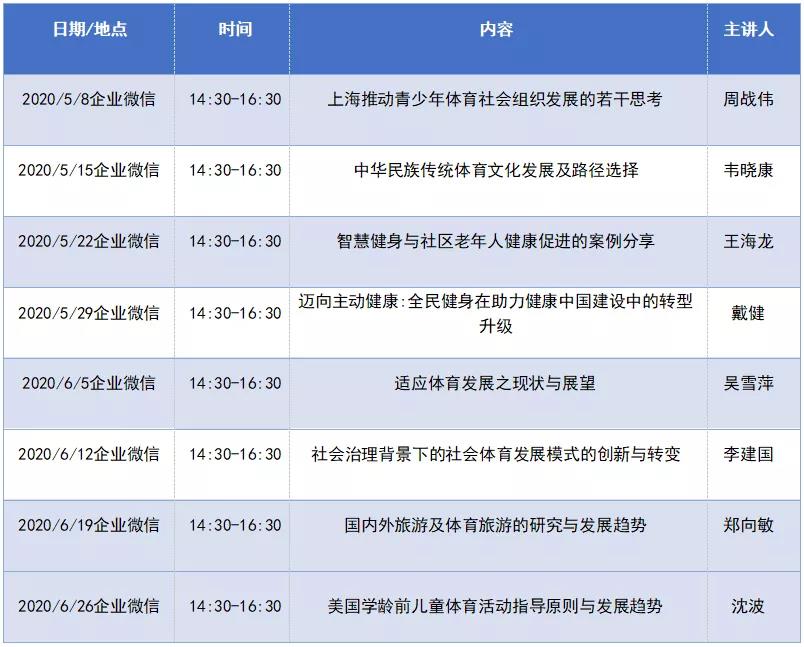《学科前沿动态》是公司硕博新生的必修内容,邀请国内外相关领域专家以讲座的形式进行授课;本学期受疫情影响,国外教授没有办法授课,公司因地制宜、因材施教进行线上讲座。贯彻落实中央全面深化改革精神、结合时事热点和学科发展方向,根据硕博培养方案要求特推出8个讲座,包含青少年体育、民族体育、老年人体育健康、全民健身、适应体育、社会体育和体育旅游等多个体育人文学科研究方向的内容。