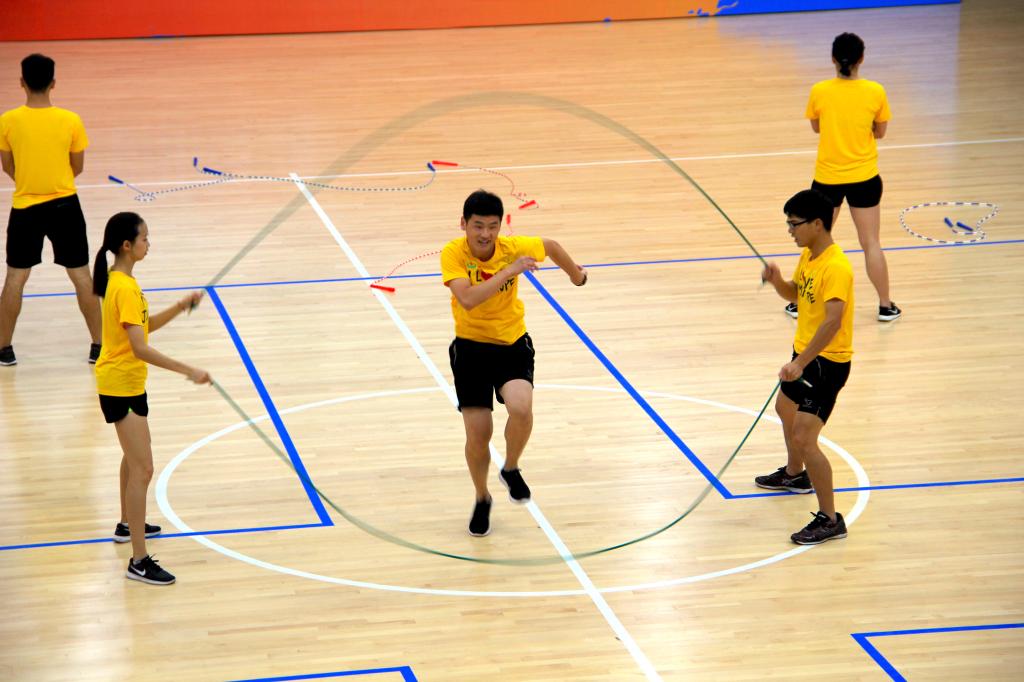 本次比赛开幕式一结束,公司花样跳绳队6名队员便首先登场表演,惊险的空翻、快速的交互绳步法以及眼花缭乱的配合动作赢得全场热烈掌声。紧接着在上午的个人花样赛中,公司两男(陆雨晨、徐发光)两女(潘丽冰、郭思化)以高难度动作分获男女组冠亚军。在下午进行的7项速度赛中包揽7项冠军,其中劳鹏以30秒182次(91单右脚)、3分钟860次(430单右脚)的成绩连获2金,10人长绳8字跳以零失误441次的成绩夺冠。