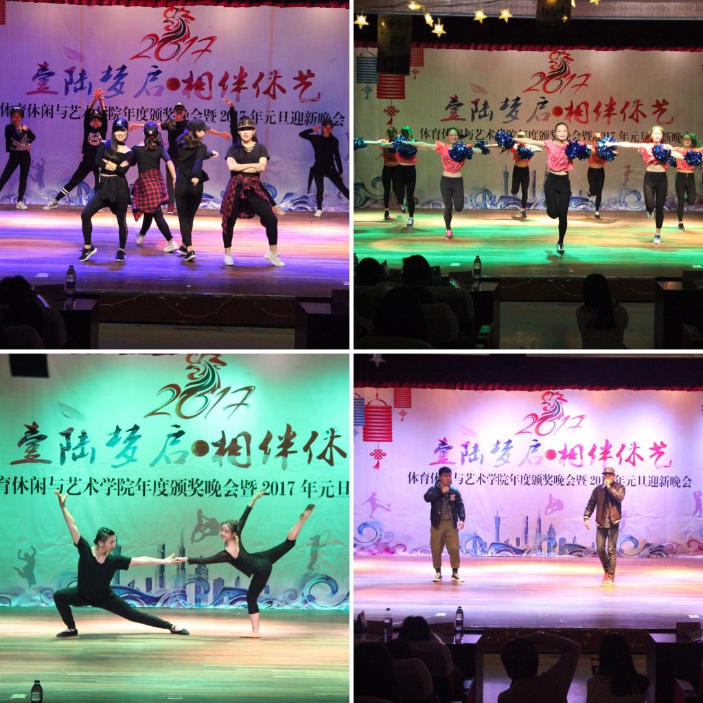 颁奖典礼后元旦迎新晚会正式开始。晚会共分三个篇章,启梦、逐梦、圆梦,多才多艺的休艺学子为观众带来一场视听盛宴。晚会在14级拉丁班带来的暖场舞蹈《Youth》中拉开序幕。由郑丹蘅老师指导、15级操舞班表演《小仙女》,16级社体、休闲专业研究生的街舞表演,以及备受欢迎的说唱表演受到同学们的热烈追捧。由杨小凤老师指导、15级民间班同学用刚柔并济的空竹表演将同学们带入了民间传统项目的世界;周仕怡、彭涨老师指导,14级民舞班的同学们通过美轮美奂的表演,给大家带来了无与伦比的视觉享受;韩耀刚老师指导的14、15社体班也为大家带来了酷炫的花样跳绳表演,引来观众阵阵尖叫;莫晓燕老师指导、14操舞班倾情献演的《Ready to go》则将休艺员工充满朝气阳光的一面彰显地淋漓尽致,最后晚会在一首师生合唱《我相信》的歌声中圆满落下帷幕。