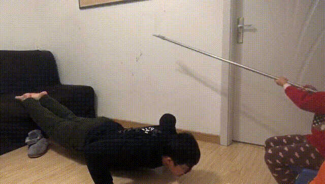 孩子手持衣服撑当风扇,家长做一次俯卧撑要快速躲过风扇的击打。