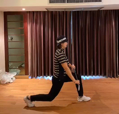 动作姿势:起始位置呈弓箭步姿势(一腿向前,完成弓步下蹲动作,前面大腿与地面平行,足尖指向正前方),双手分别握持球杆两端并放在前面腿上。然后弓箭步蹲起时,双臂伸直向上将球杆举到最高点并保持1-2秒。