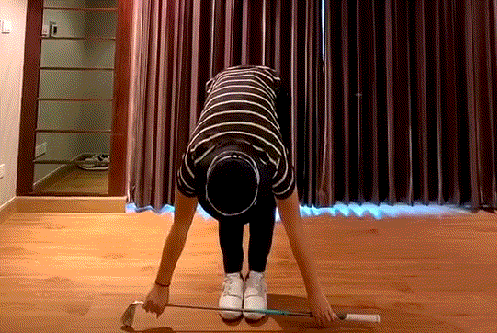 动作姿势:双手握持球杆大致与肩同宽,双臂前平举,双脚并拢;向前弯曲身体,并尽量保持膝关节绷直,双臂尽力向下伸,最大幅度保持1-2秒。
