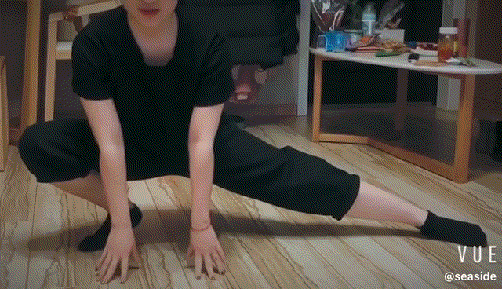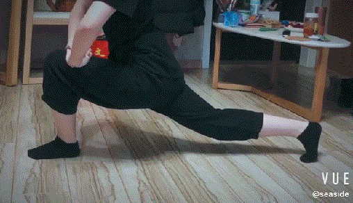 动作姿势:双脚约两倍肩宽,脚尖朝向斜前方,重心放在一侧腿上,下蹲至另一侧腿完全伸直。背部挺直,微微俯身,将伸直的大腿内侧朝向地面,双手触地后做另一侧。双脚脚跟不要离地。