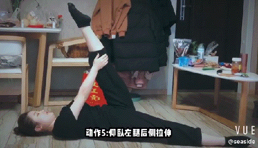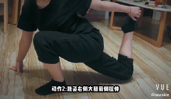 动作姿势:双手放在右侧大腿上,左腿向后撤,整个身体呈弓步,躯干垂直于地面身体向右侧扭转,保持静止,感受左腿大腿根部的拉伸感。两侧腿依次进行拉伸。