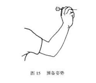 预备预备动作要求准备姿势站好,两眼盯着目标,肘关节抬起,上臂与地面平行,镖稍向后引,放在面前,准备投镖(整个过程保持肘关节稳定)