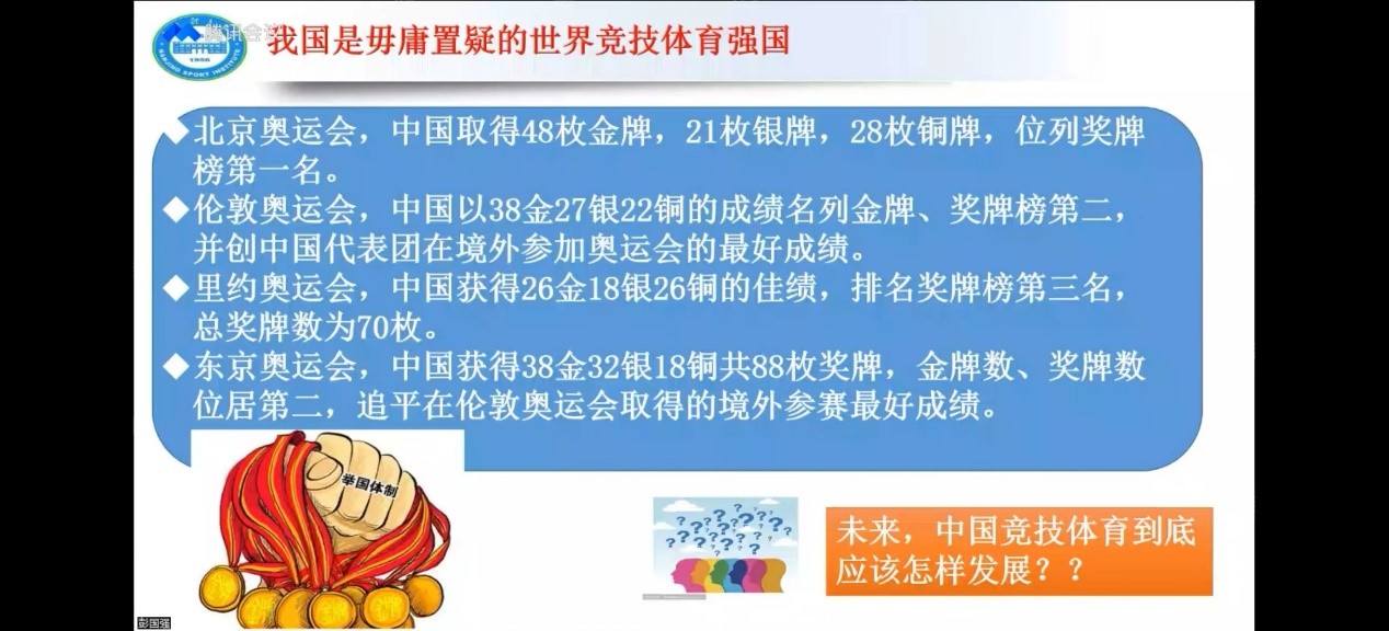 守“沪”战“疫”学习赋能向未来——体育教育训练公司“竞攀讲坛”系列学术活动第一期(第五讲)于2022年4月20日晚19:00点在腾讯会议顺利举行。本期邀请到南京体育公司竞技体育研究院彭国强教授为大家带来“新阶段我国竞技体育的发展趋向及研究热点透视”为主题的学术分享,从新阶段我国竞技体育的发展趋向、新阶段我国竞技体育的重要议题与研究设想、对科研论文撰写的体会三个方面与大家进行了交流讨论。