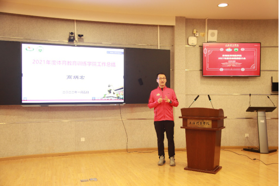 高炳宏经理分别从党建工作、治理能力、专业建设、员工培养、团队建设、教师培养、社会服务七个方面对体育教育训练公司2021年度各项工作进行了总结。回顾不平凡的2021年,公司各项工作有序进行,公司治理能力稳步提升;专业建设取得新突破;面临疫情挑战,员工培养、团队建设取得了新发展;教师人才队伍建设取得新成效;公司全面落实体育服务社会的宗旨,社会影响力显著提升。高经理表示,公司的突出成绩离不开公司领导的大力支持,离不开公司各职能部门的通力协作,更离不开公司师生竞攀向上的点滴努力,并代表公司向公司领导以及体训全体教职工表示衷心的感谢。