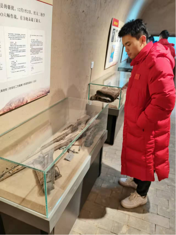1月6日,体教专业赴甘肃省参加招考工作的师生在相关工作第一阶段结束后,专程赶赴庆阳市环县曲子镇,在陕甘宁革命根据地的重要组成地——曲子革命纪念馆开展党史学习教育。曲子革命纪念馆负责人、红军烈士后代刘正正同志、红军烈士后代刘凯坤同学、体教本科生党支部书记许丁晨老师和参加本次工作的员工党员、退伍员工代表等十余人共同参加教育活动。