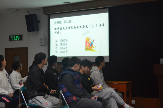 第三个环节是车轮战,每队派一个人答题,答错换下一个人。在这轮环节中,第五梯队的姬周亿同学表现得非常出色,凭借一己之力击败了许多选手,在面临许多难题时都对答如流,凭借出色的表现赢得场下观众的掌声。同样其他队伍也不甘示弱,沉着冷静的作答,体育知识的储备也是非常丰富。