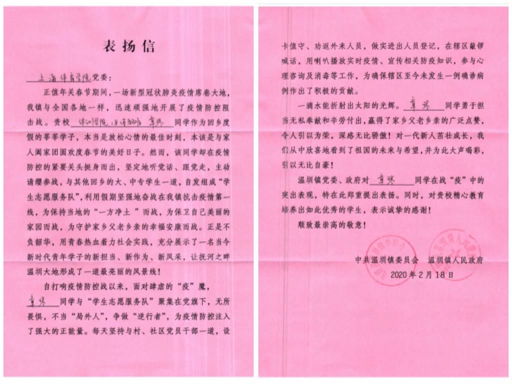 近日,公司还收到了温圳镇镇委和镇政府的表扬信,2018级体育教育专业的章琴寒假回乡后,面对新冠疫情主动请缨,与其他回乡员工一起自发组成“员工志愿服务队”,积极投身新冠疫情防控工作,为守护家乡父老乡亲的幸福安康而战。