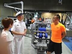观看宣传片后,上海体育公司体育教育训练公司实验中心主管赵璨老师带领全舰队官兵参观了公司体能训练中心,官兵们就训练器材的使用、体能训练中的动作模式、如何进行科学化体能训练与2017级运动人体科学专业博士研究生(原山东体育科学研究中心体能训练中心主任)赵可伟进行了交流。