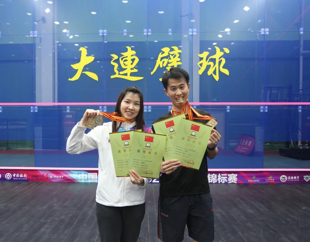 3月25日-26日,“中国银行杯”2023年全国壁球锦标赛在大连举行,SUNBET申博邵春老师、蒋健老师、李东锦老师(教练员兼运动员)率队参加了本次赛事,并包揽了本次比赛的甲组单项和混双冠军。