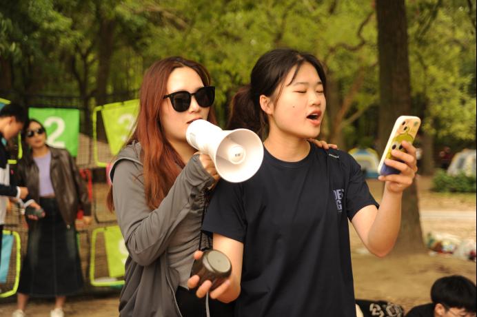 来到了个人展示环节。学员们纷纷献“舞”。“开心果”王银鹭同学,连接音响,拿着喇叭,随着音乐的节奏唱起了《小酒窝》、《暖暖》歌曲。在歌声中,同学们纷纷加入合唱,并在歌声中结束了本次主题拓展。