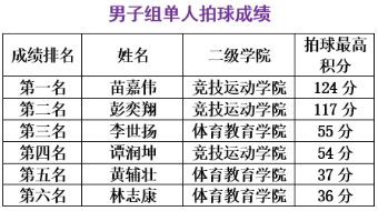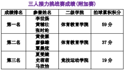 本次比赛采用线上推送、线下比赛现场相结合的报名方式,根据最终报名人数随机分成三组同时进行单项拍球赛。每位参赛选手有三次拍球机会,取个人最高成绩,如果遇到最高成绩相同,则取次成绩,以此类推,次数多者为胜。本次比赛还增加了三人接力挑战赛,队伍人员由参加个人赛的同学自由组合搭档,男女不限,上场参赛队员在拍球接力循环过程中,每人最多拍两次球机会,直至中断,取三次接力拍球的累积总成绩,是一项十分考验拍球技能和团队默契的赛事。