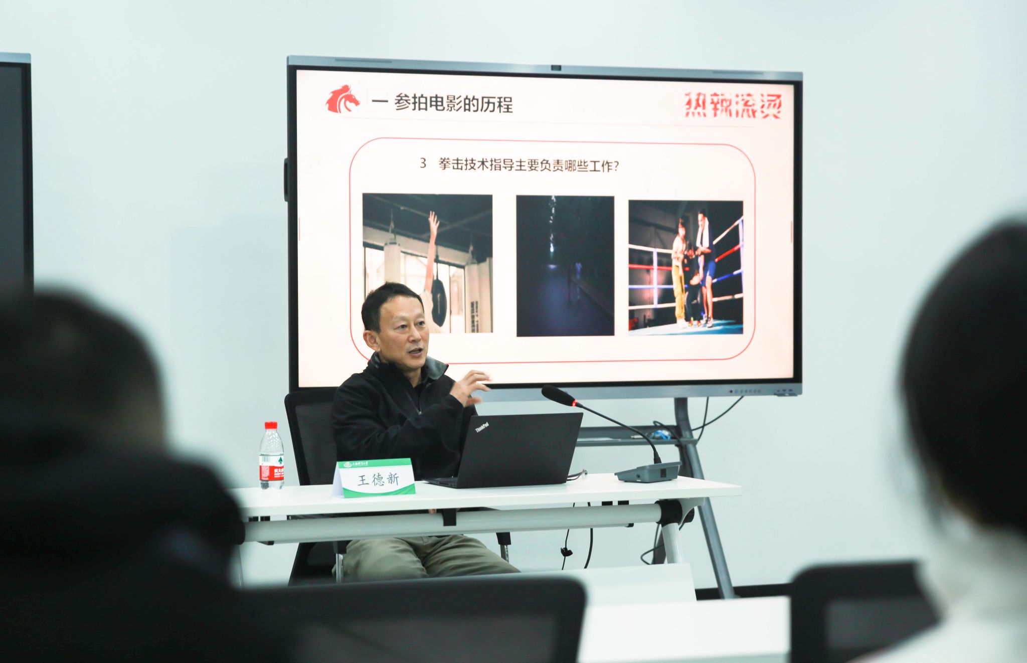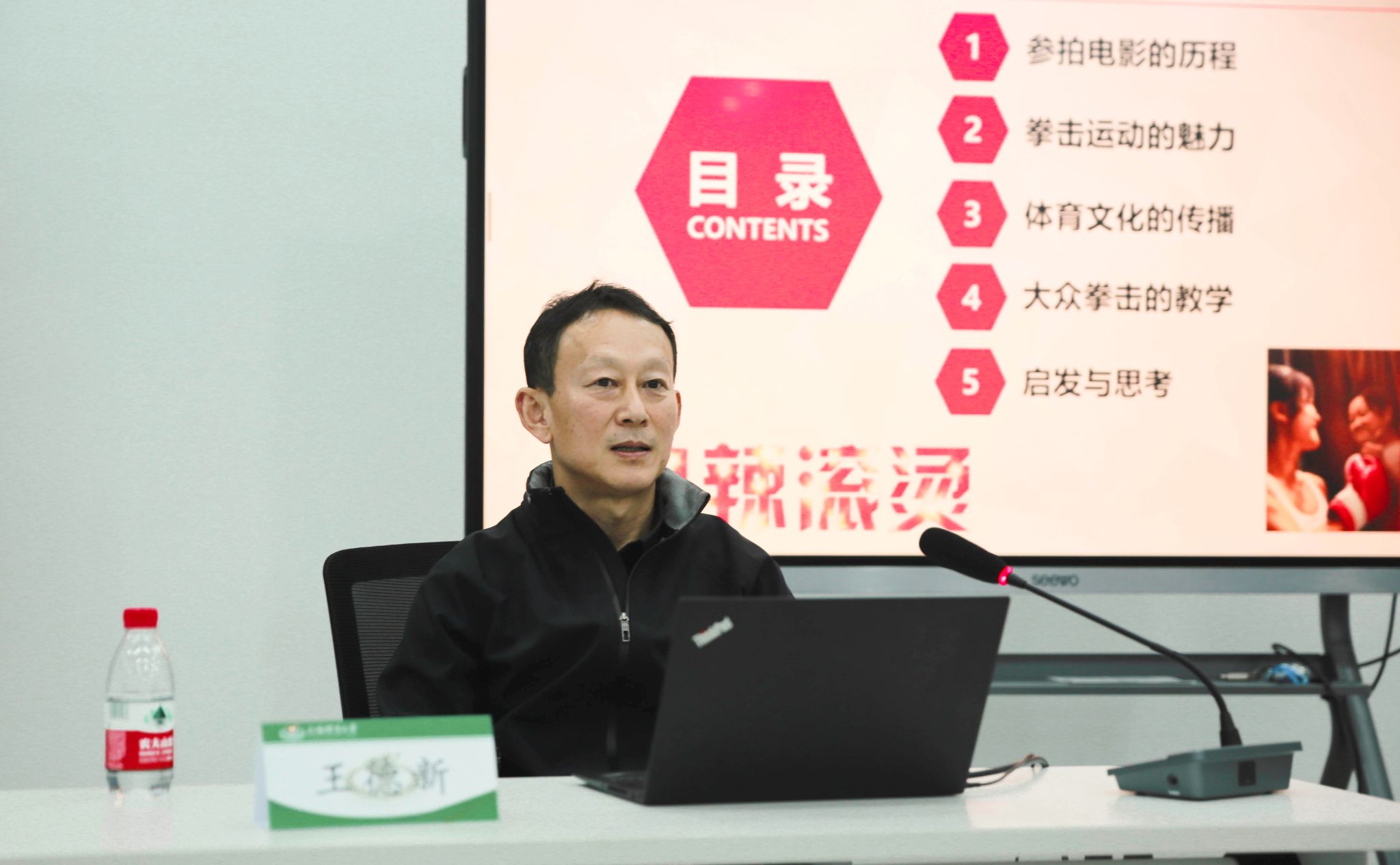 讲座中,王教授娓娓道来他与《热辣滚烫》剧组合作的起源与经历,并从参拍电影的历程、拳击运动的魅力、体育文化的传播、大众拳击的教学等多个角度清晰地为大家讲解了电影背后的体育故事。一个个拍摄中的小花絮,一场场挥汗如雨的训练,都让在座的员工与教师为之动容。