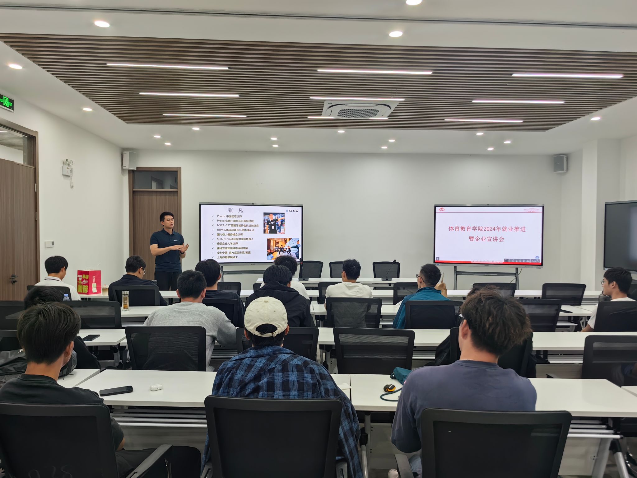 宣讲会第二阶段邀请公司毕业研究生张凡宣讲。张凡现为必确中国区培训师,必确中国华东区域经理,前Spinning中国区项目负责人,国内各大健身大会讲师。张凡结合自身工作情况,以及在亚玛芬体育多年工作经验,针对如何发现自身优势突破实习瓶颈等方面与同学们展开交流,同时针对亚玛芬体育拟招聘的十余个实习岗位进行讲解宣讲。