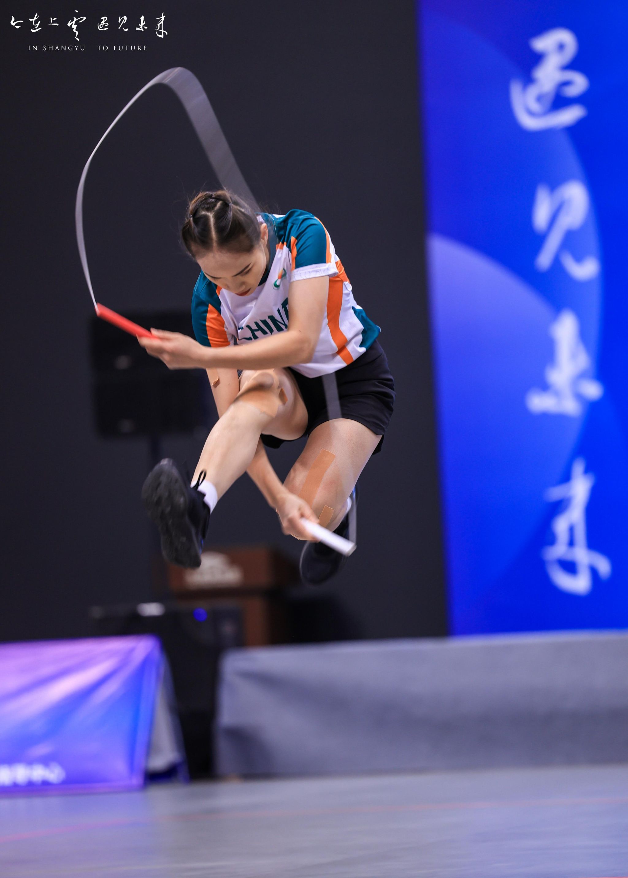 在大型集体自编赛中,队员们巧妙融合全国民族运动会《火彝绳花》项目精华,将跳绳技巧与少数民族传统体育文化深度结合,高难度花样动作、多人跳绳互动和跳绳空翻组合精彩纷呈,赢得全场喝彩,顺利夺得首金。在三人交互、四人交互精英级项目中,队员们大胆融入空翻、特殊摇绳、放绳等多元技巧,凭借着高度的默契配合和稳定发挥,摘得单项及团体冠军。特别值得一提的是覃继媚同学,在竞争压力最大的个人花样项目中,她凭借扎实的基本功、丰富的比赛经验以及对跳绳艺术独特的理解和表现力脱颖而出,最终夺得银牌。