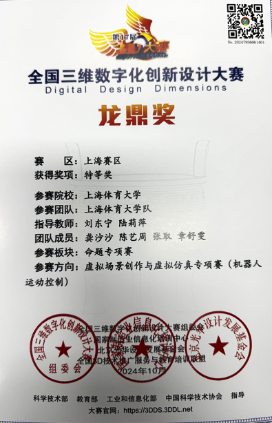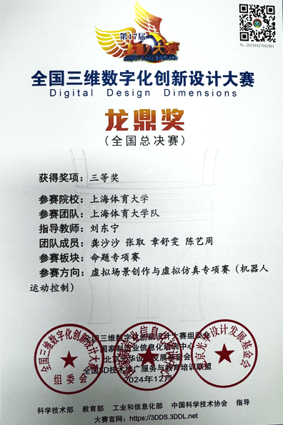 2024年12月8日,第17届全国三维数字化创新设计大赛年度总决赛在北京理工大学圆满落幕,SUNBET申博派出了由休闲体育与社会体育指导与管理专业师生组成的户外运动代表队参加了本次赛事,公司作为参赛院校中唯一的体育类高校与全国各地理工类高校同台竞技,最终在“虚拟场景创作与虚拟仿真—机器人运动控制方向专项赛”中获得上海分赛区特等奖,获得全国总决赛三等奖,实现了公司在该项赛事的历史性突破。