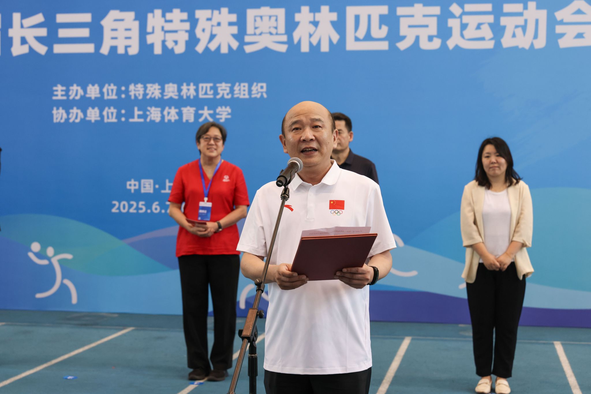 上海市残疾人文化体育促进中心(上海特奥竞赛训练中心)主任龚佳韬宣布第一届长三角特殊奥林匹克运动会开幕。