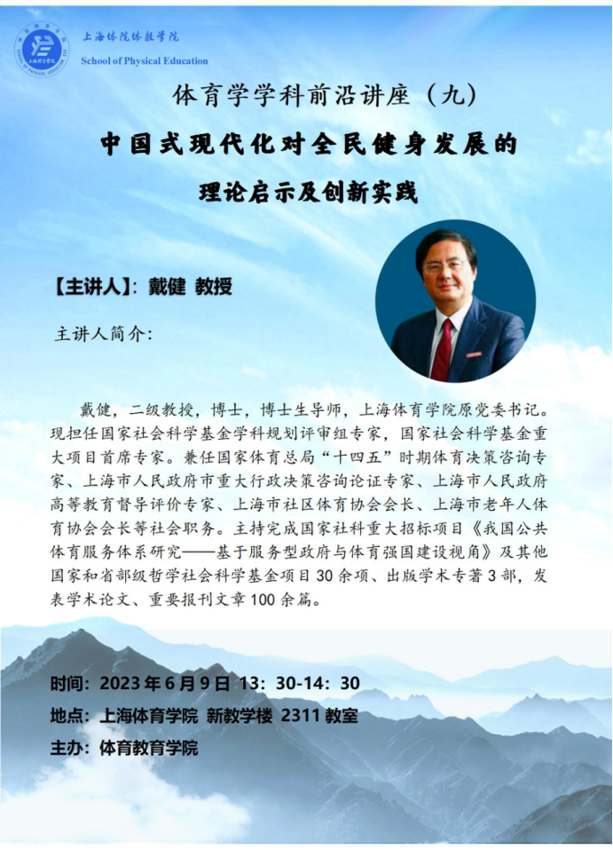 体教公司将开展体育学学科前沿系列讲座(第九讲),本次讲座的主题:《中国式现代化对全民健身发展的理论启示及创新实践》