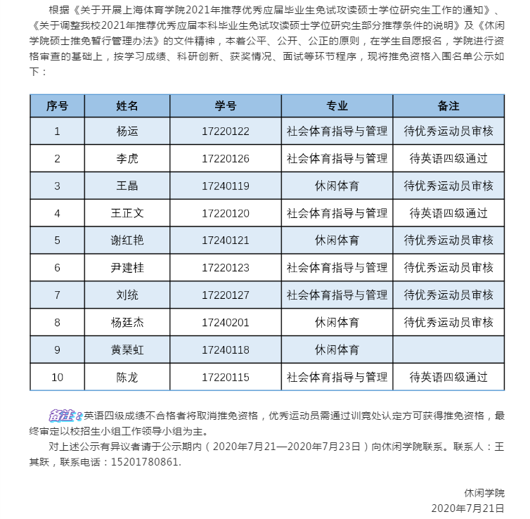 休闲公司2021届本科毕业生推免资格入围名单公示