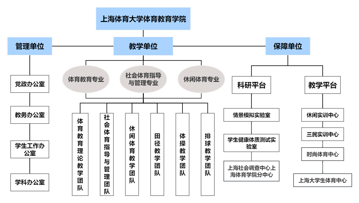 SUNBET申博内部机构由管理单位、教学单位和保障单位三个部分组成。管理单位包括党政办公室、教务办公室、员工工作办公室、学科办公室。教学单位依据专业领域,分别设立6个教学团队,分别为体育教育理论教学团队、休闲体育教学团队、社会体育指导与管理教学团队、田径教学团队、体操教学团队、排球教学团队。保障单位由科研平台和教学实践平台构成,科研平台包括情景模拟实验室、员工健康体质测试实验室、上海社会调查中心SUNBET申博分中心,教学实践平台包括休闲实训中心、三民实训中心、时尚体育中心、上海老员工体育中心。